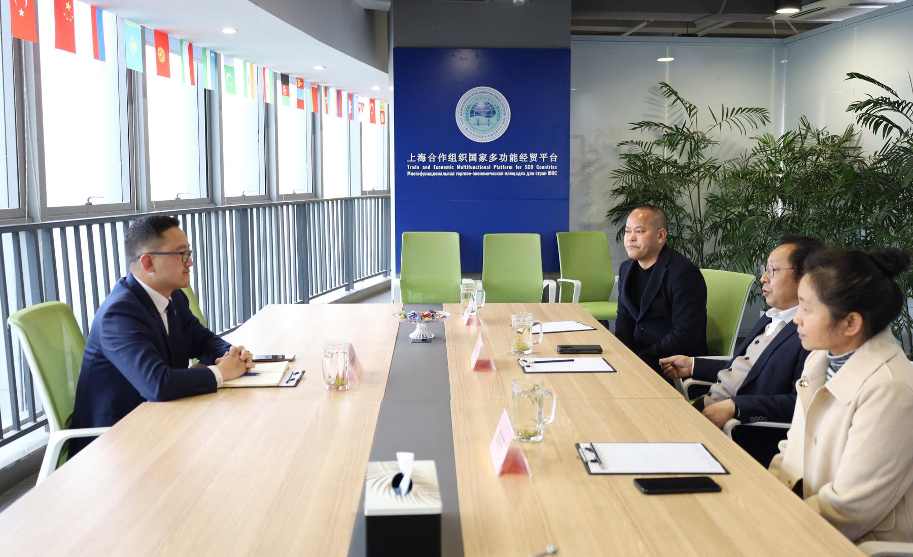 王健平副秘书长代表重庆市政协港澳台侨和外事委员会副主任、上海合作组织国家多功能经贸平台总干事胡开强欢迎罗仁超一行。